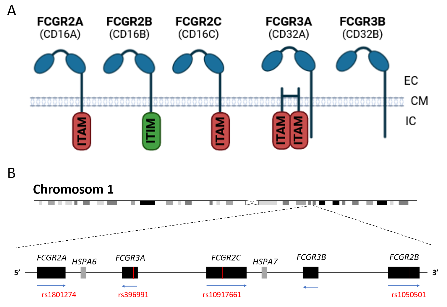 Abbildung 1 FCGRs mit niedriger bis mittlerer Affinität; A) FCGR2&3-Familien mit ihrem extrazellulären (EC) Rezeptorteil und intrazellulären (IC) Signaltransduktionsteil. ITAM: Immunrezeptor-Tyrosin-basiertes Aktivierungsmotiv, ITIM: Immunrezeptor-Tyrosin-basiertes inhibitorisches Motiv; B) FCGR-Lokus auf Chromosom 1q23.3. In Rot bekannte SNVs, die die FCGR-Funktion beeinflussen.